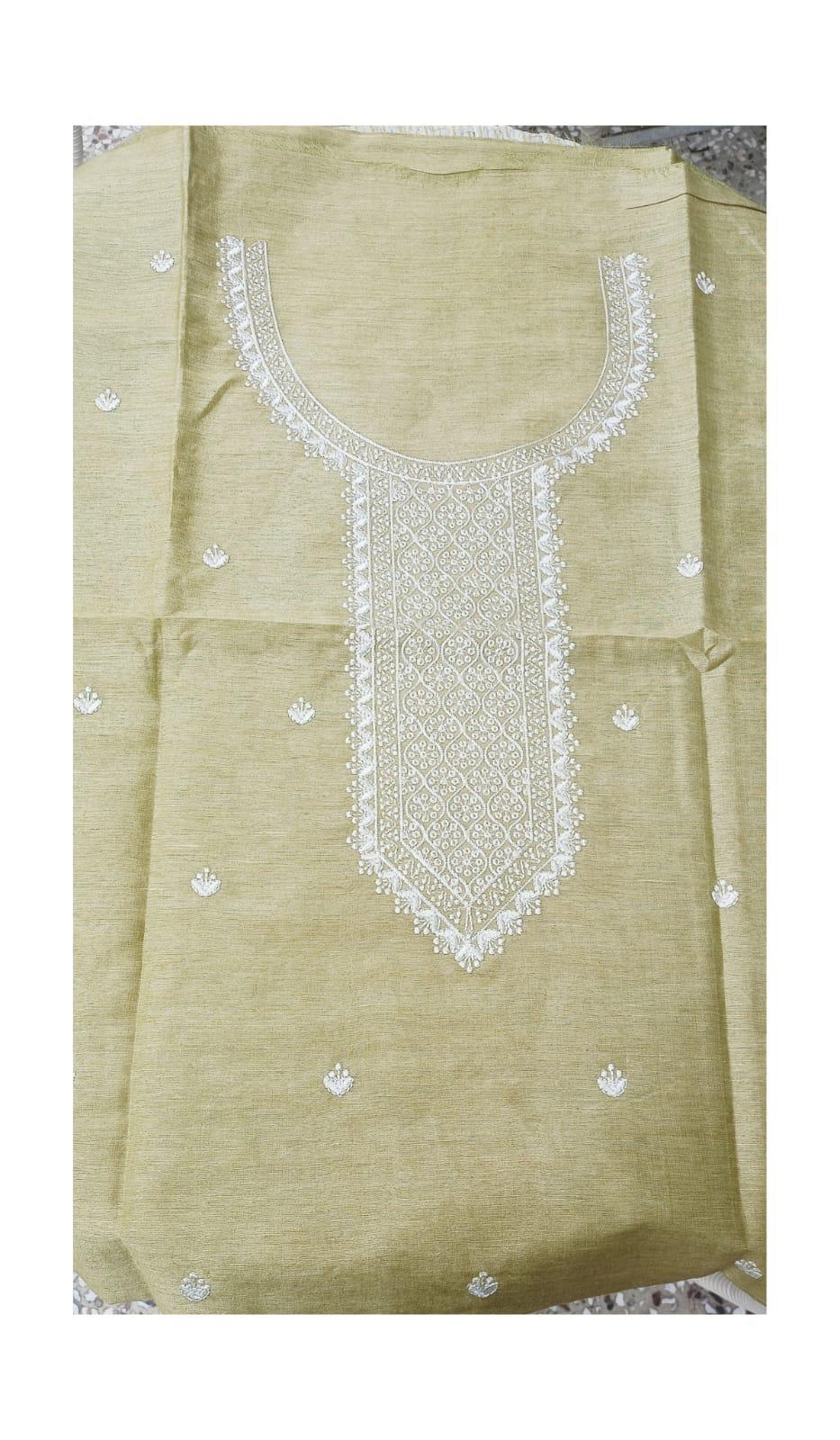 Sophisticated Light Olive Green (Pistachio) Linen Silk kurta fabric elevated by detailed White contrast machine embroidery.