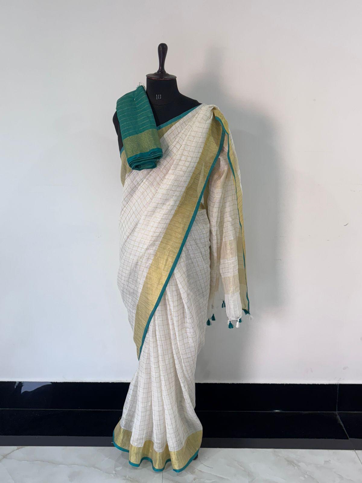 Celebrate Onam in elegance with this premium off-white linen saree featuring a subtle checkered texture, gold-green borders, and a matching green blouse piece. Total length: 6.5m + 1m blouse. Price: ₹3800