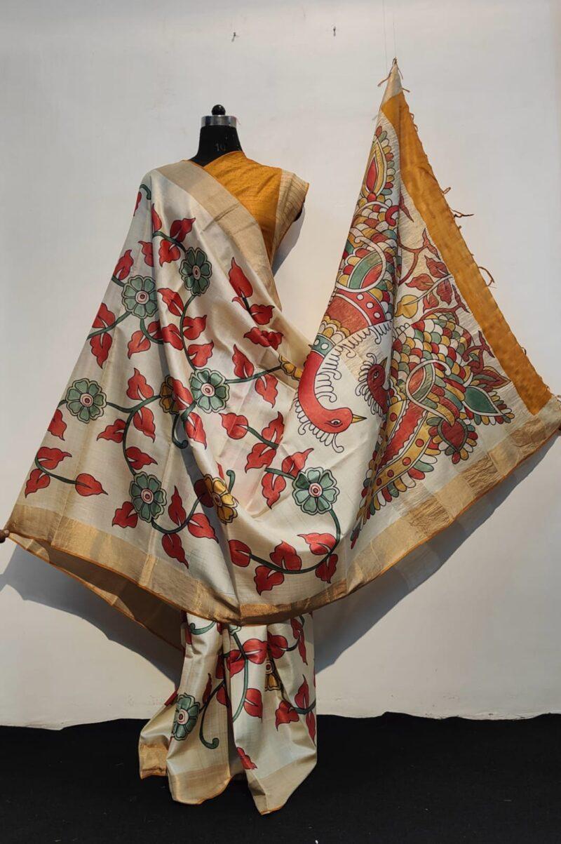 The true allure of this Tussar Silk Saree lies in its exquisite, organic hand-painted design. Each piece is a unique work of art, meticulously painted by skilled artisans, making it a celebration of traditional craftsmanship and contemporary aesthetics. The organic color palette used in this saree not only adds vibrancy but also reflects our commitment to eco-friendly practices.