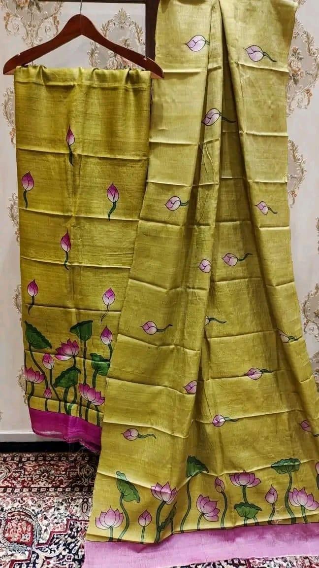 Two Piece Suit Tussar Silk (Green with Pink Lotus)