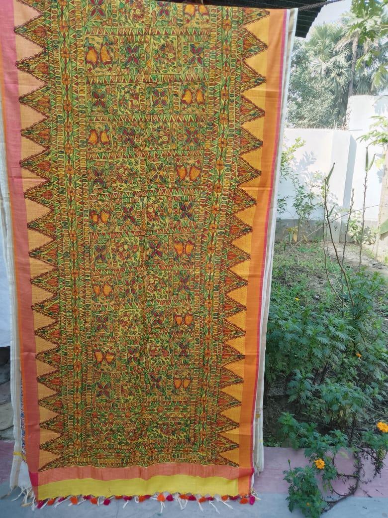 Elevate your style with our Linen Dupatta adorned with exquisite Madhubani art. This remarkable piece is a true celebration of artistry and tradition.