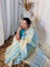 Style this Blue and Yellow Linen Saree with silver or pearl jewelry for a soft, elegant look. For a bolder statement, opt for oxidized accessories and a sleek hairstyle. A subtle nude makeup look or a pop of yellow-toned lipstick will beautifully complement the vibrant contrast.