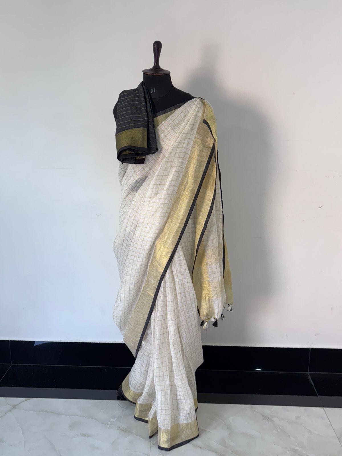 Premium off-white linen saree with checkered texture, adorned with gold and black borders. Comes with a matching black blouse piece with gold border. Length: 6.5m + 1m blouse. Price: ₹3800.
