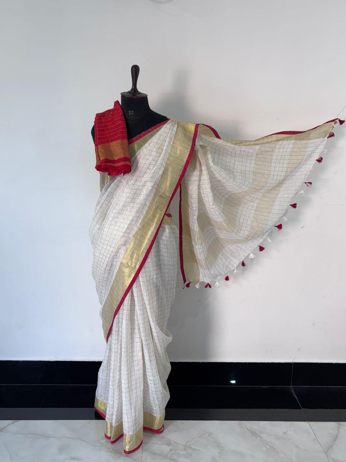 Elegant off-white linen saree with checkered pattern, rich gold and red borders, and red-white tassels. Comes with a red blouse piece featuring a gold border. Length: 6.5m + 1m blouse. Price: ₹3800.