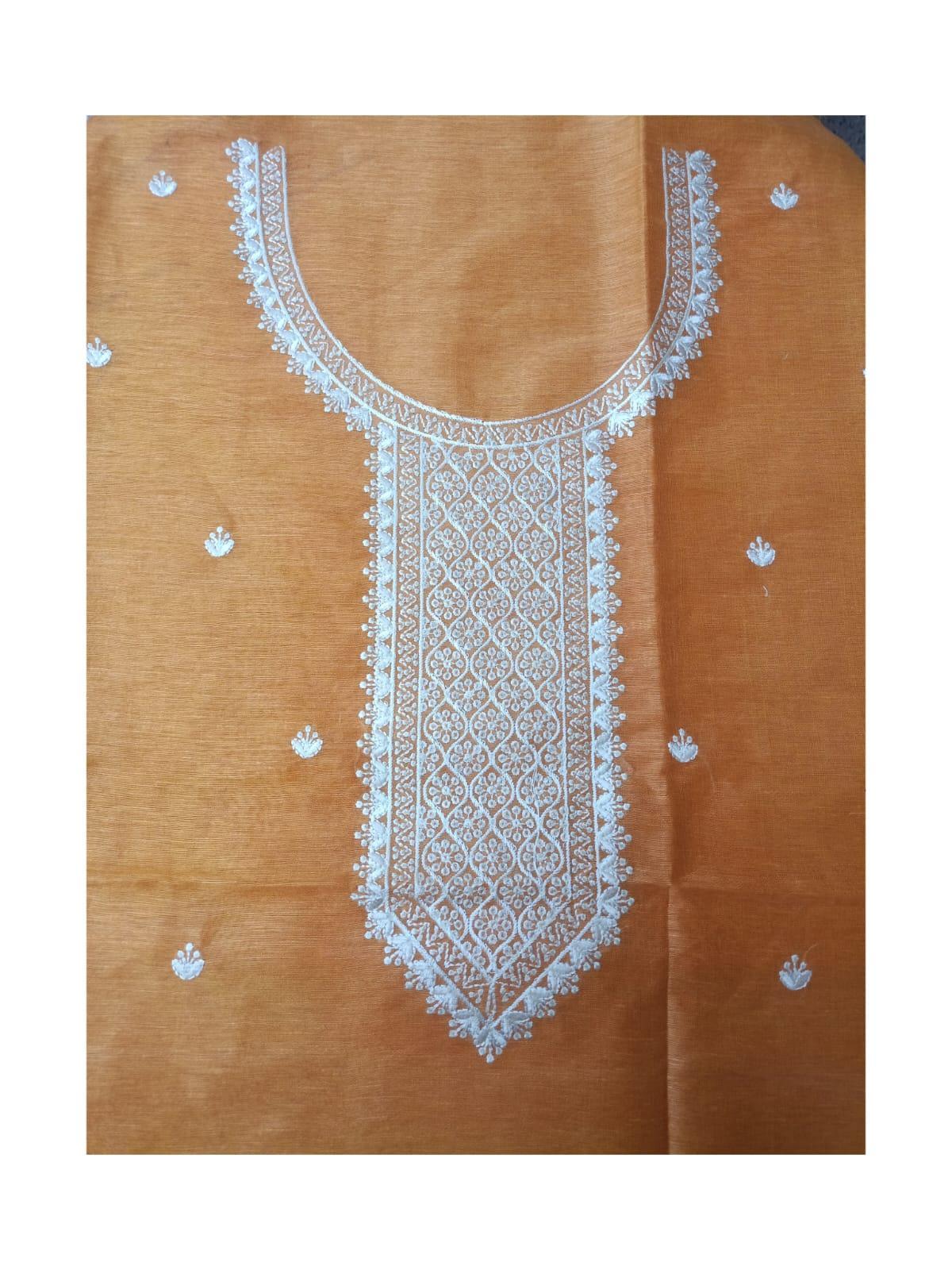 Eye-catching Bright Orange Linen Silk kurta fabric embellished with fine White contrast machine embroidery, perfect for a vibrant, festive look.