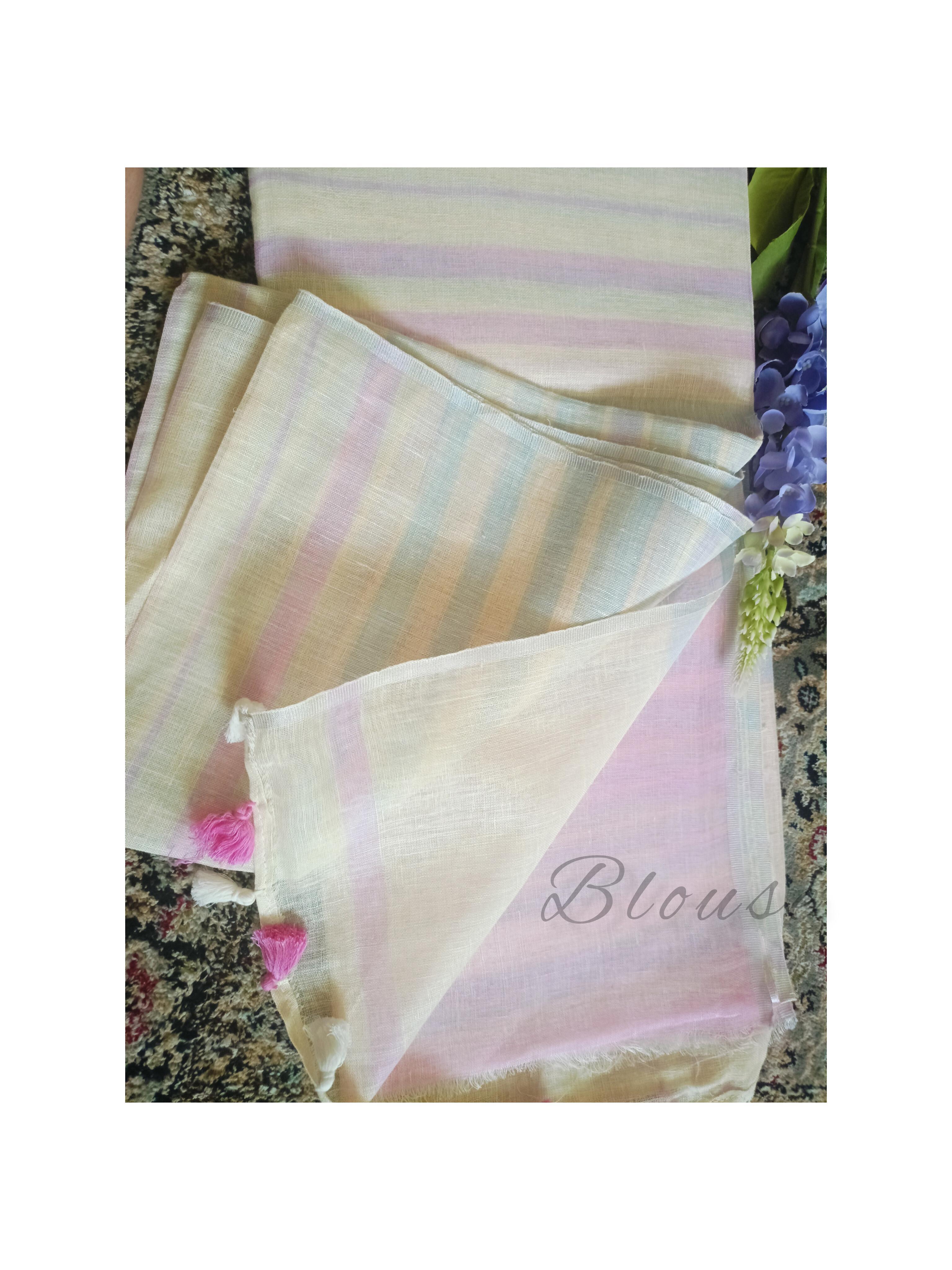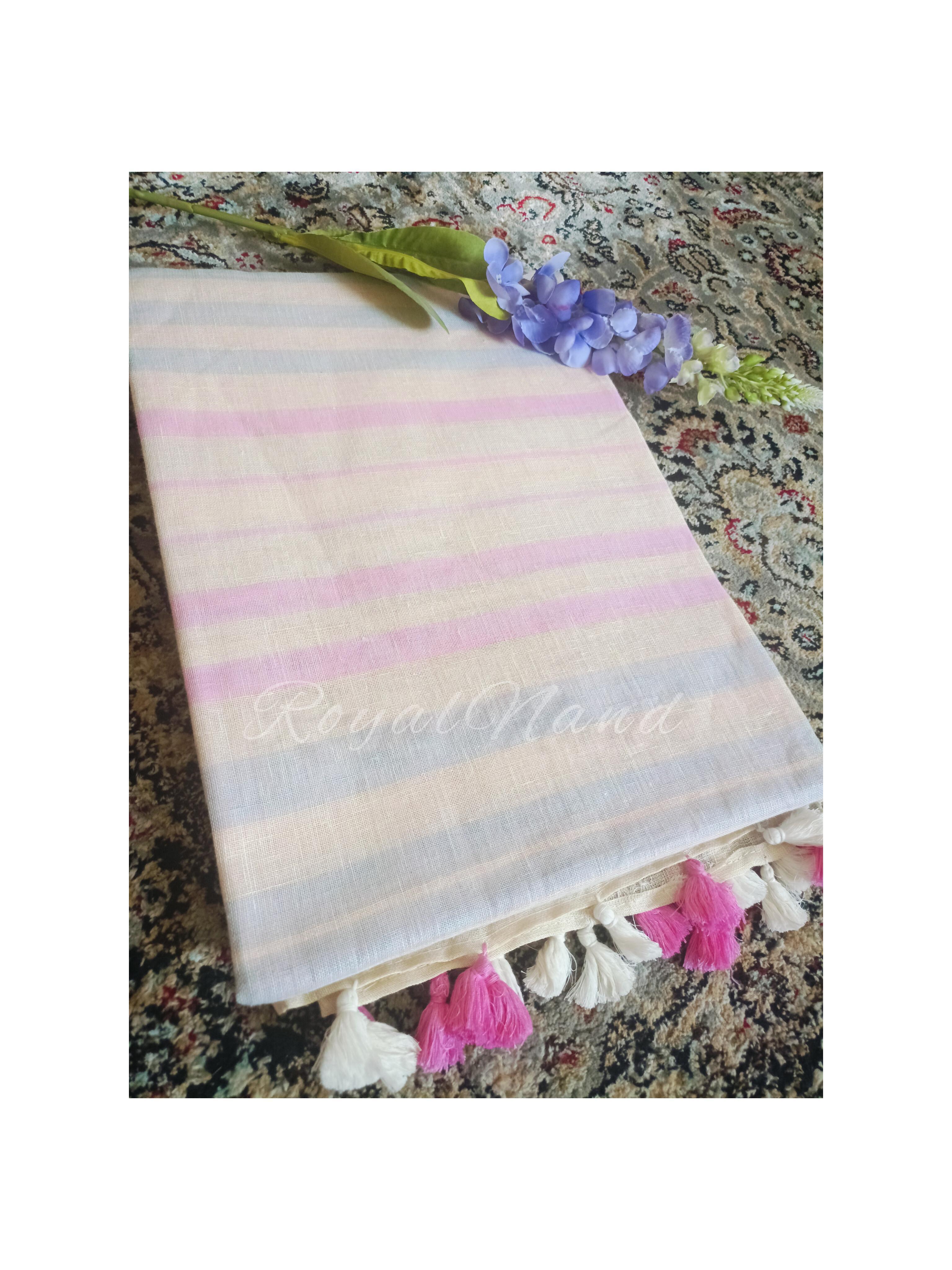 An exceptionally soft Pure Linen Saree in a sophisticated English Colour base, highlighted by horizontal stripes of Pink and Powder Blue. This comfortable, breathable saree is finished with dual-toned tassels, making it perfect for elegant daytime outings, casual wear, or summer gatherings. Total Length: 6.5m (includes running blouse piece). Dry Clean Recommended.
